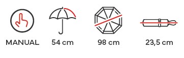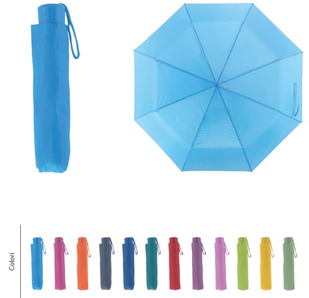 Ombrello pieghevole in tessuto poliestere tinta unita, impugnatura in colore.